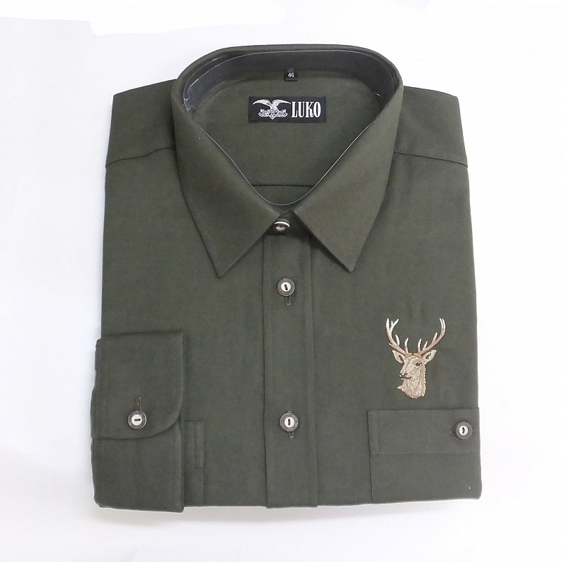 Flanelová jednobarevná košile s výšivkou jelena a knoflíky z imitace parohu. Košile má dvě náprsní kapsičky se zapínáním na knoflíky.